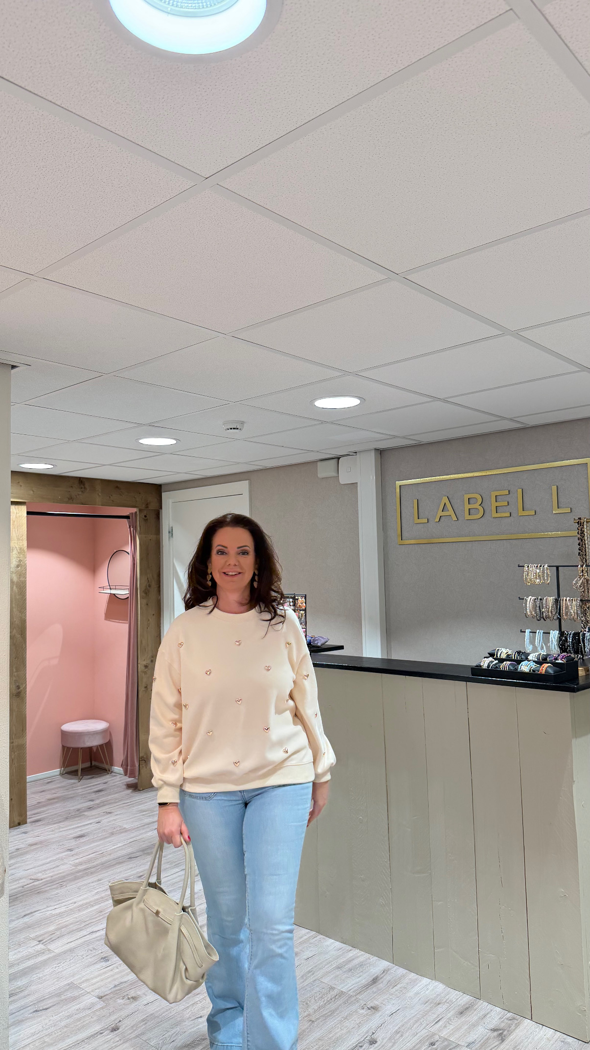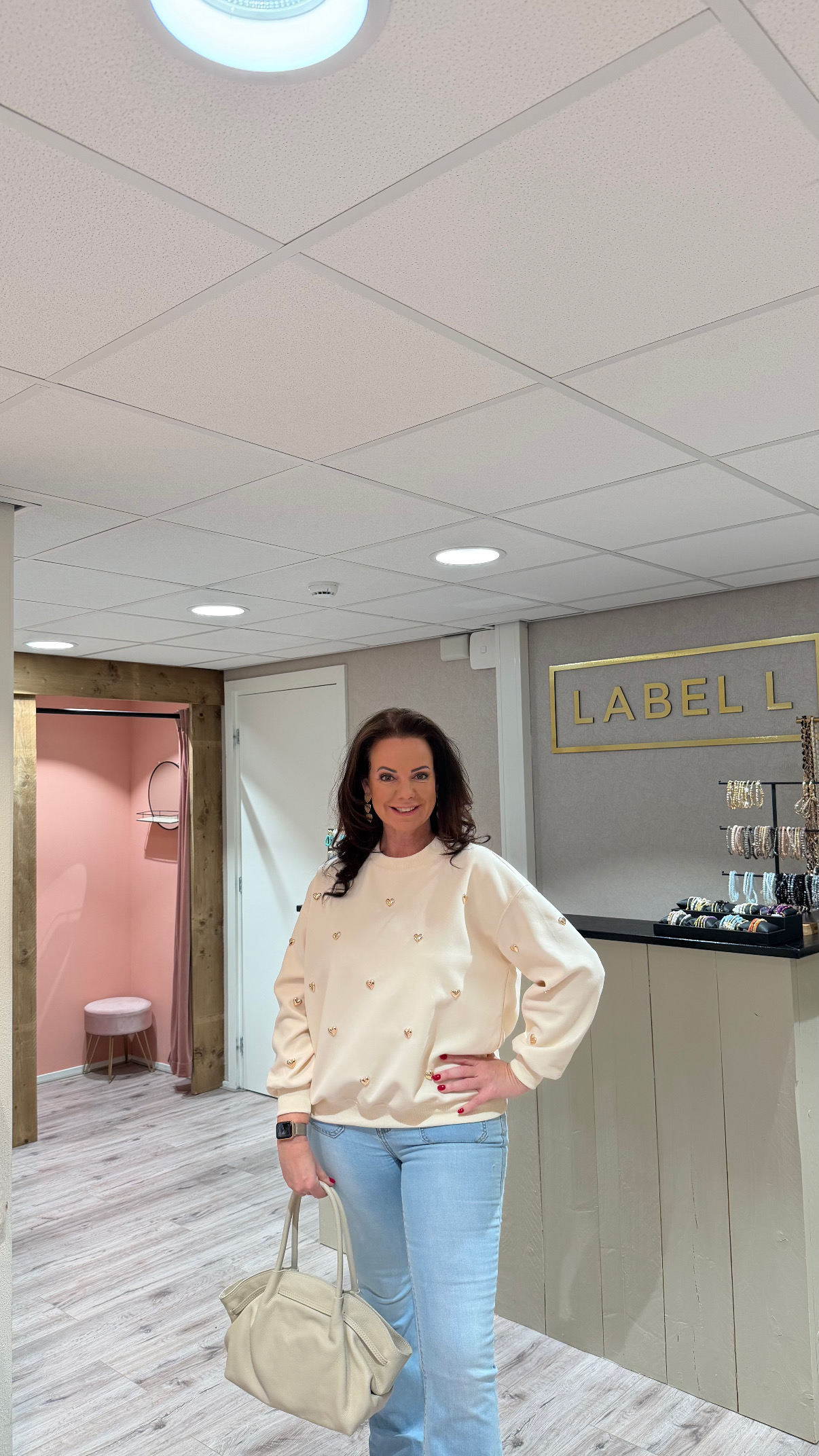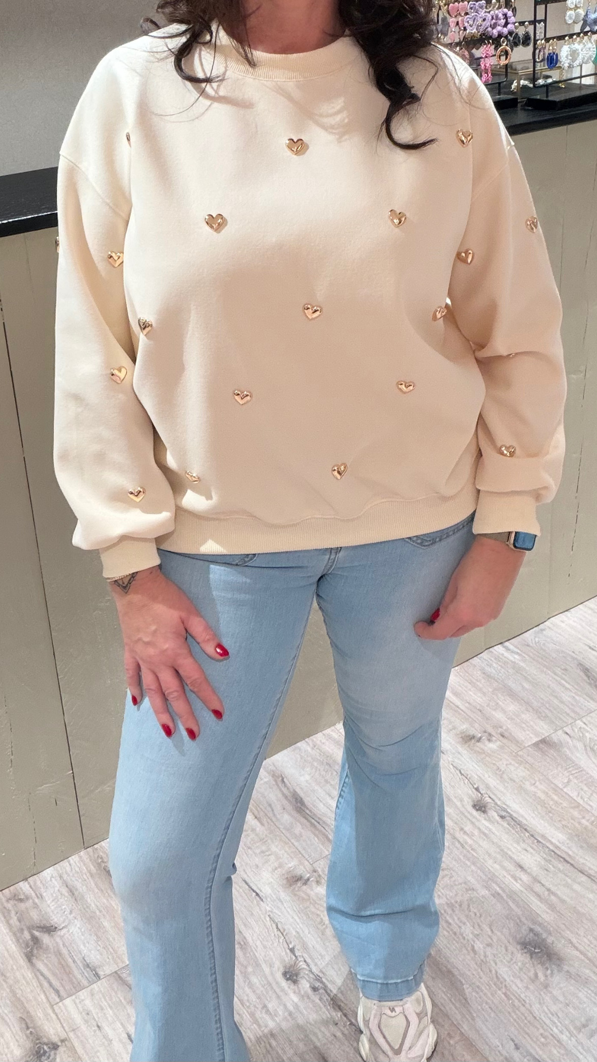 Trendy, comfy en stijlvol! Deze zachte sweater met glimmende gouden hartjes is perfect te combineren met je favoriete jeans of pantalon.