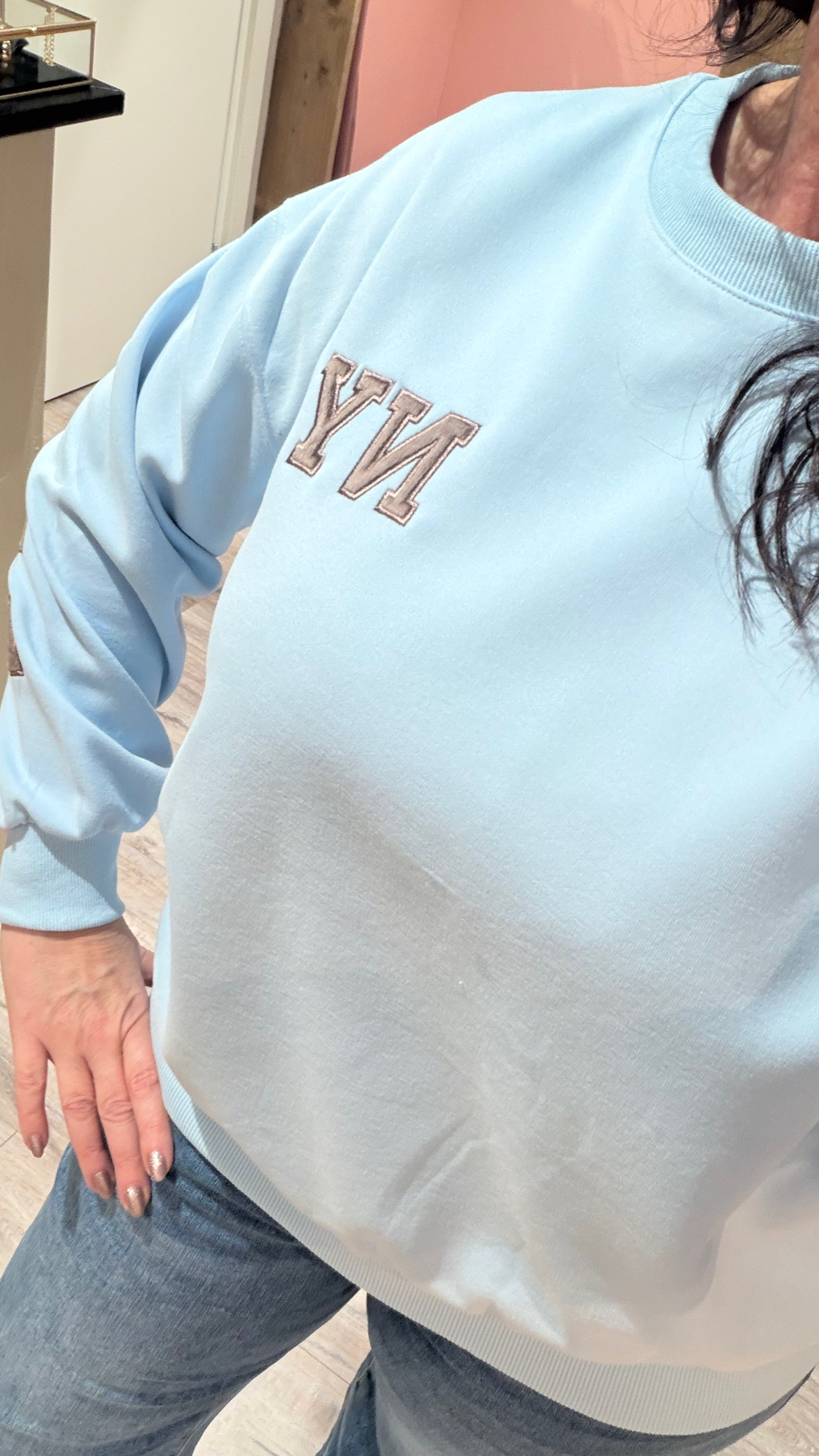 De combinatie van lichtblauw met taupe geeft deze sweater een frisse, moderne uitstraling. De subtiele “New York” opdruk in taupe zorgt voor een trendy detail zonder te overheersen. Ideaal om te combineren met een jeans, witte broek of casual pantalon.
